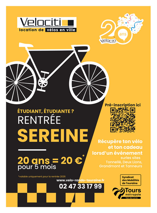 Le service de location de vélos VELOCITI fête ses 20 ans ! Pour célébrer cet anniversaire, le Syndicat des Mobilités de Touraine te propose une offre exceptionnelle : réserve dès maintenant ton vélo mécanique classique ou pliant pour la rentrée 2026 et profite de nombreux avantages :